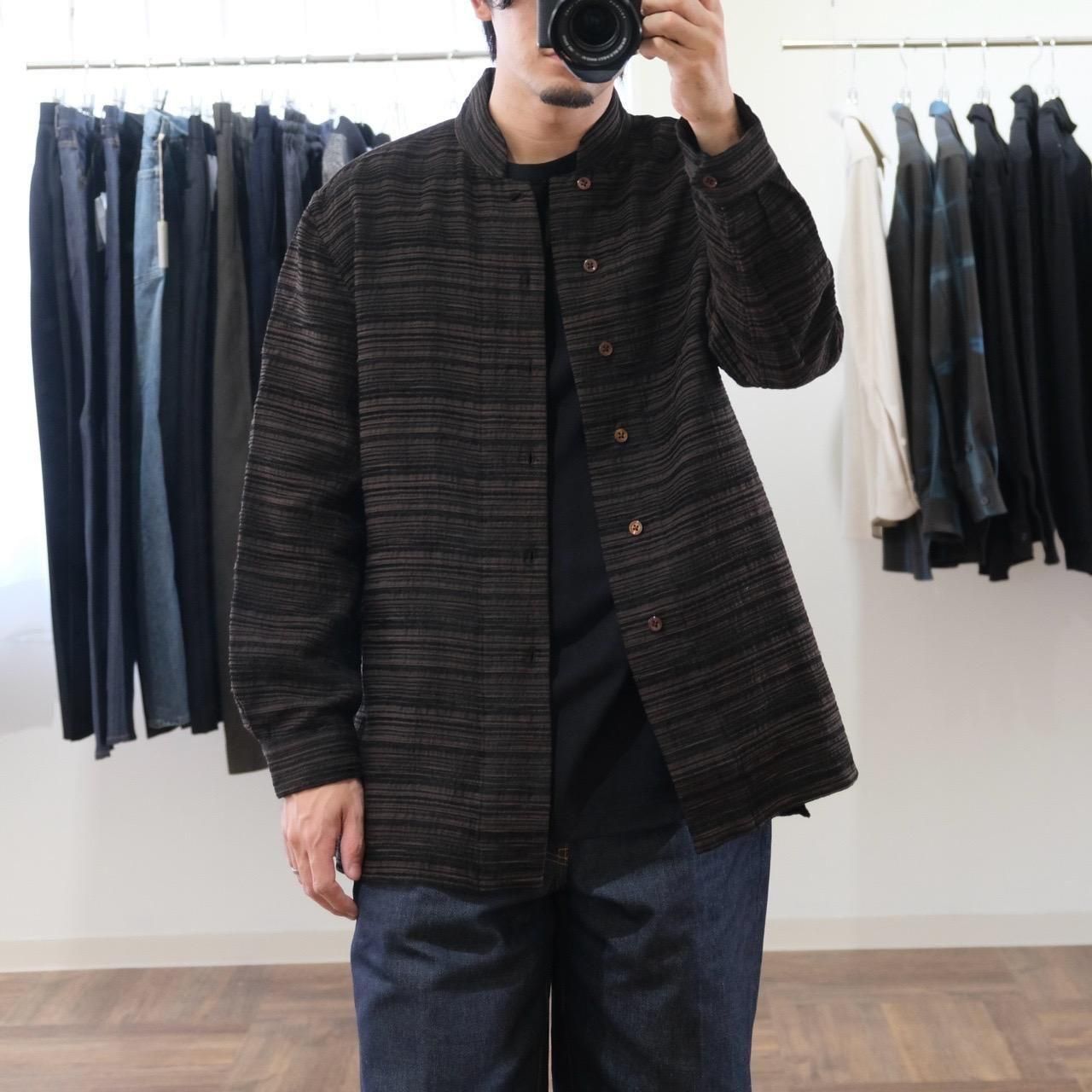 イメージはそれらよりも軽いシャツにする。敢えて首に沿わせた少し高めの衿、前後差なしのスクエアカットの裾、前の打ち合わせはジャケットのように多めに取り、肩周りや身頃のゆとりは最小限にし全体的にミニマムなシャツに仕上がりました。